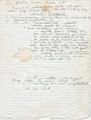 I still have the scrap of paper from that evening. The misspelling and handwriting are hers: her scrawl, so like tangled hair it was sometimes impossible to decipher. Were we drinking coffee? There’s a stain on the paper that leads me to believe we were. I see—or imagine I see—the look in her eyes that said: Who are we to think we can write a book? Who were we indeed?