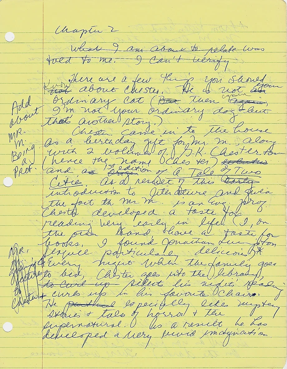 We wrote no character histories, did none of the kind of prewriting I so often do now for my novels, just put a few notes down on a single sheet of paper and began to play. Looking at that first handwritten version of Bunnicula, I can spot something I know was Debbie’s (the Romanian sheet music) or mine (Chester’s kitty sweater with the sixteen purple mice), but more often than not, I don’t know who was responsible for what. There were many times that one of us began a sentence and the other finished it.
